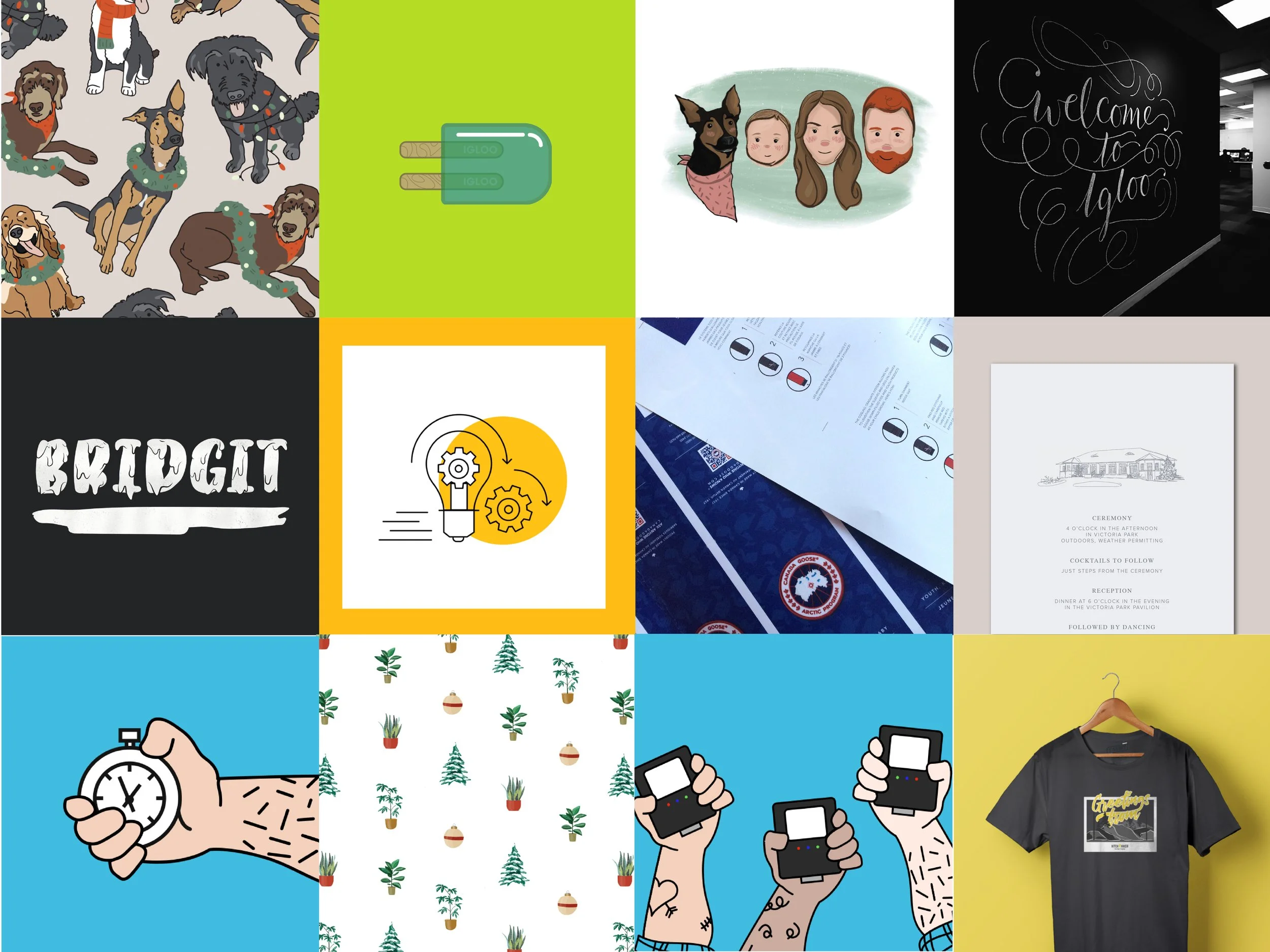 (Custom dog holiday card illustrations, corporate stickers for swag, personal family illustration, office environmental chalk mural, custom iconography sets, stationery illustrations and way-finding maps, campaign illustrations, and t-shirt designs).